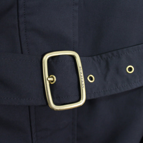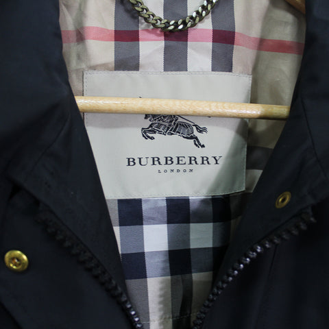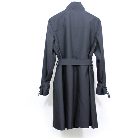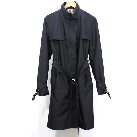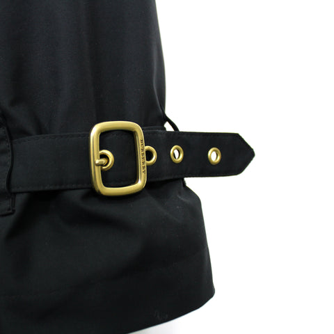 Black Burberry London Tess trench coat with slit pockets at hip, belt adornments at sleeve cuffs, belt at waist and zip front with snaps. 100% Poly...