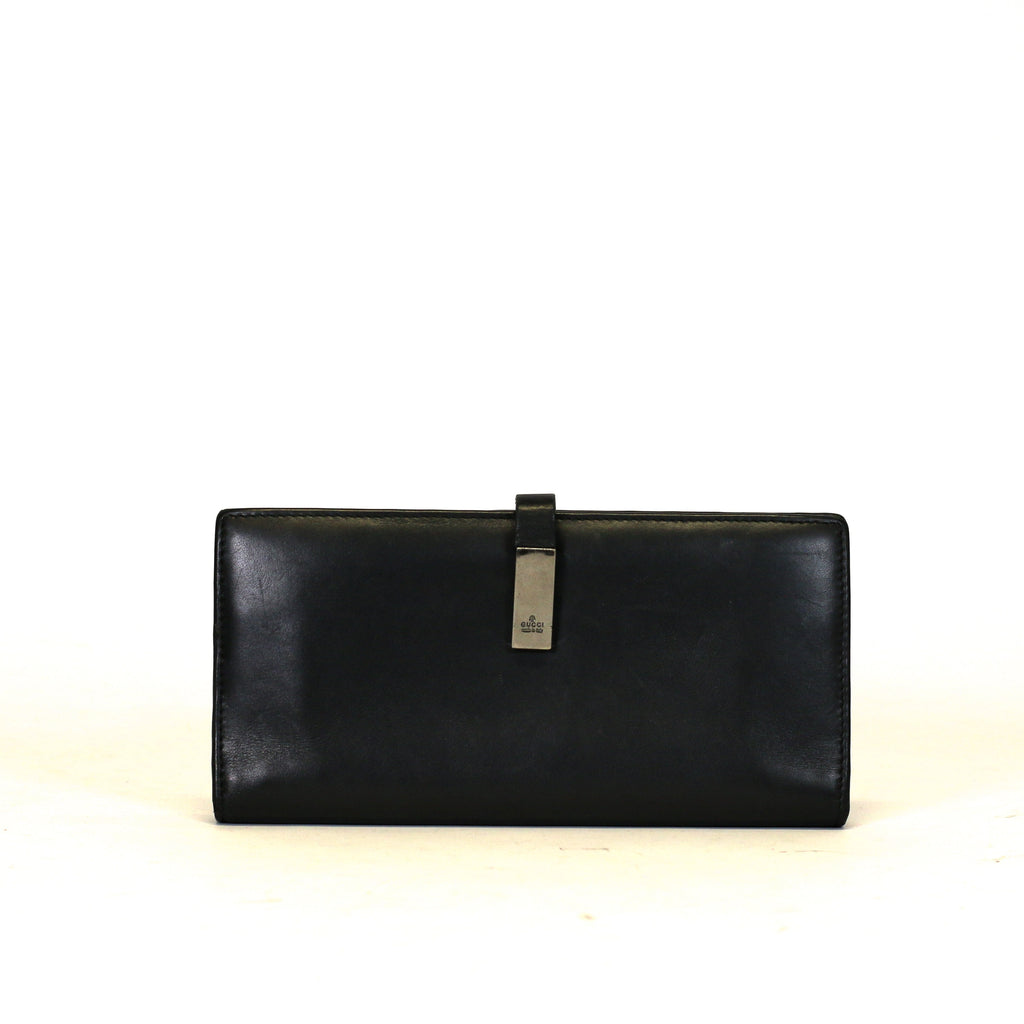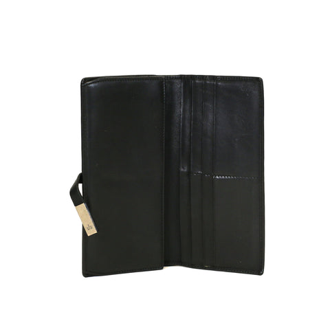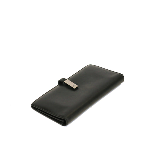 Suitable for all genders, this wallet is crafted of smooth matte black calfskin leather. The flap opens to a black leather interior with a zippere...