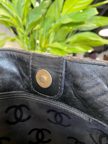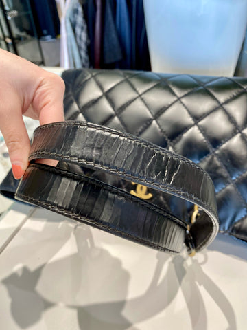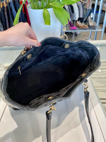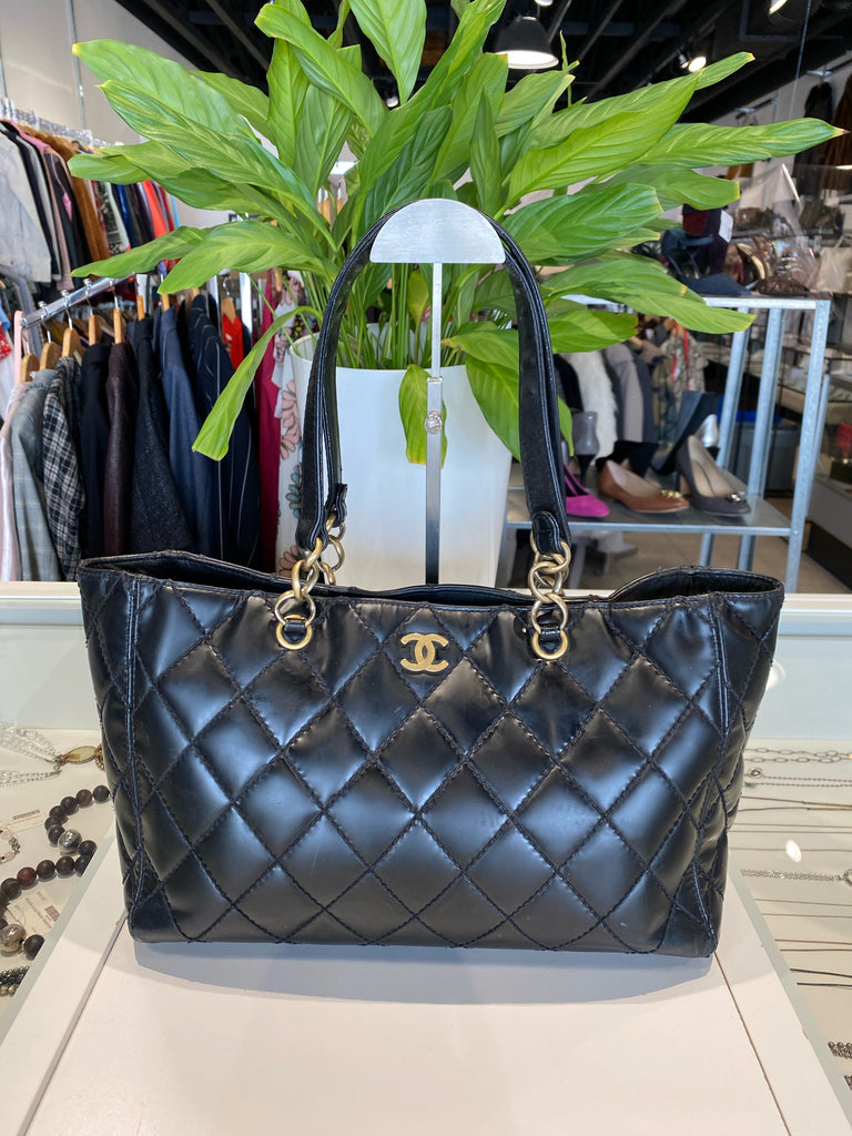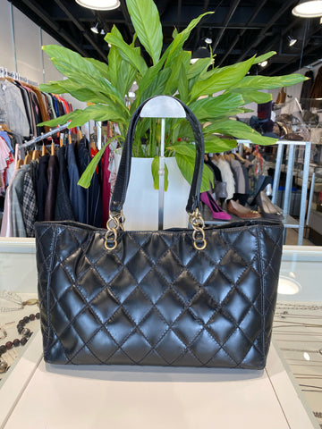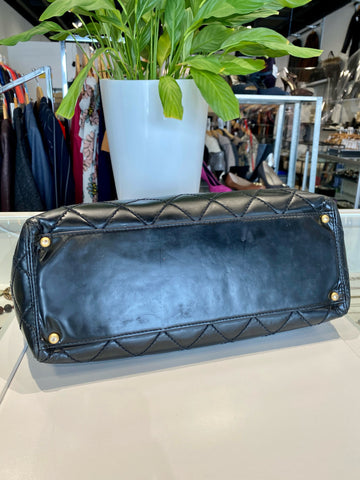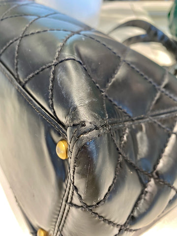 This stylish tote is finely crafted of the classic diamond quilted patent leather in matte black. The bag features matching leather top handles wit...