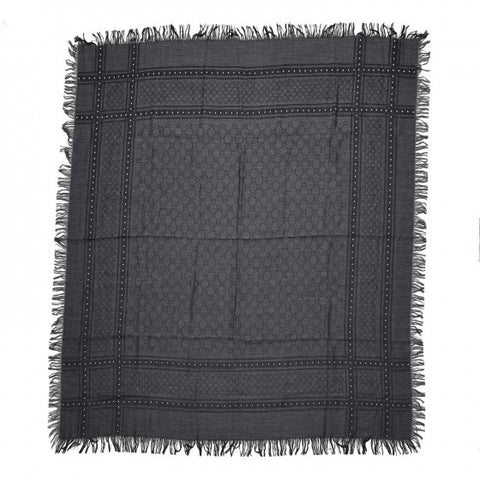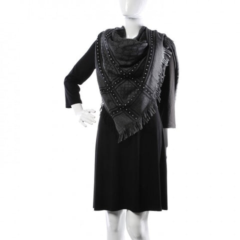 This sophisticated scarf is finely crafted of 70% wool and 30% silk with a tonal Gucci GG monogram, silver studs and fringe at either end. This is ...