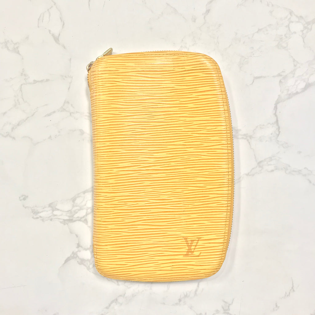 This lovely wallet is crafted of epi leather in yellow. It has a gold tone wrap-around zipper that opens to a beautiful purple leather lining with ...